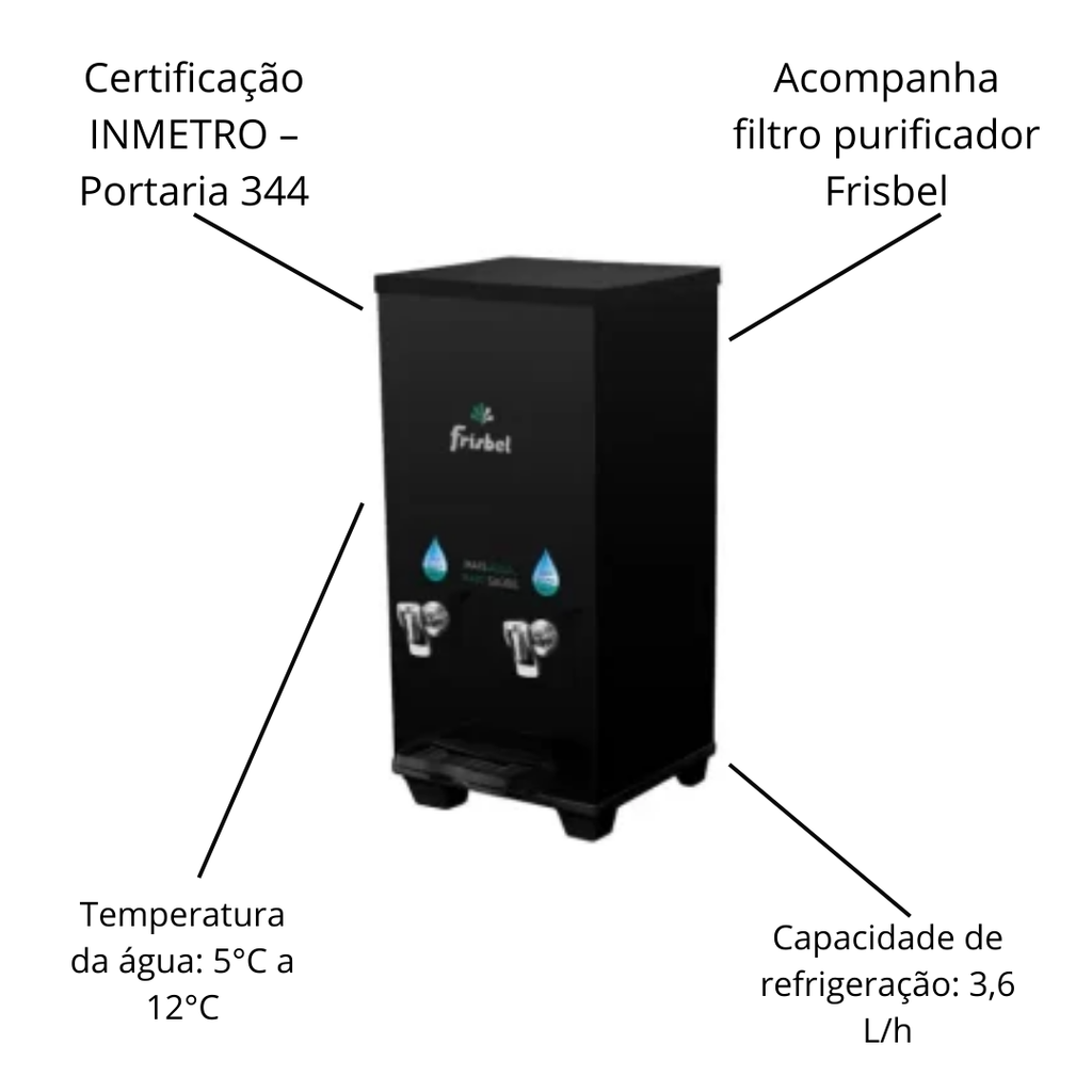 Com design moderno na cor preta, estrutura reforçada e filtro Frisbel incluso, garante água purificada com excelente capacidade de refrigeração.