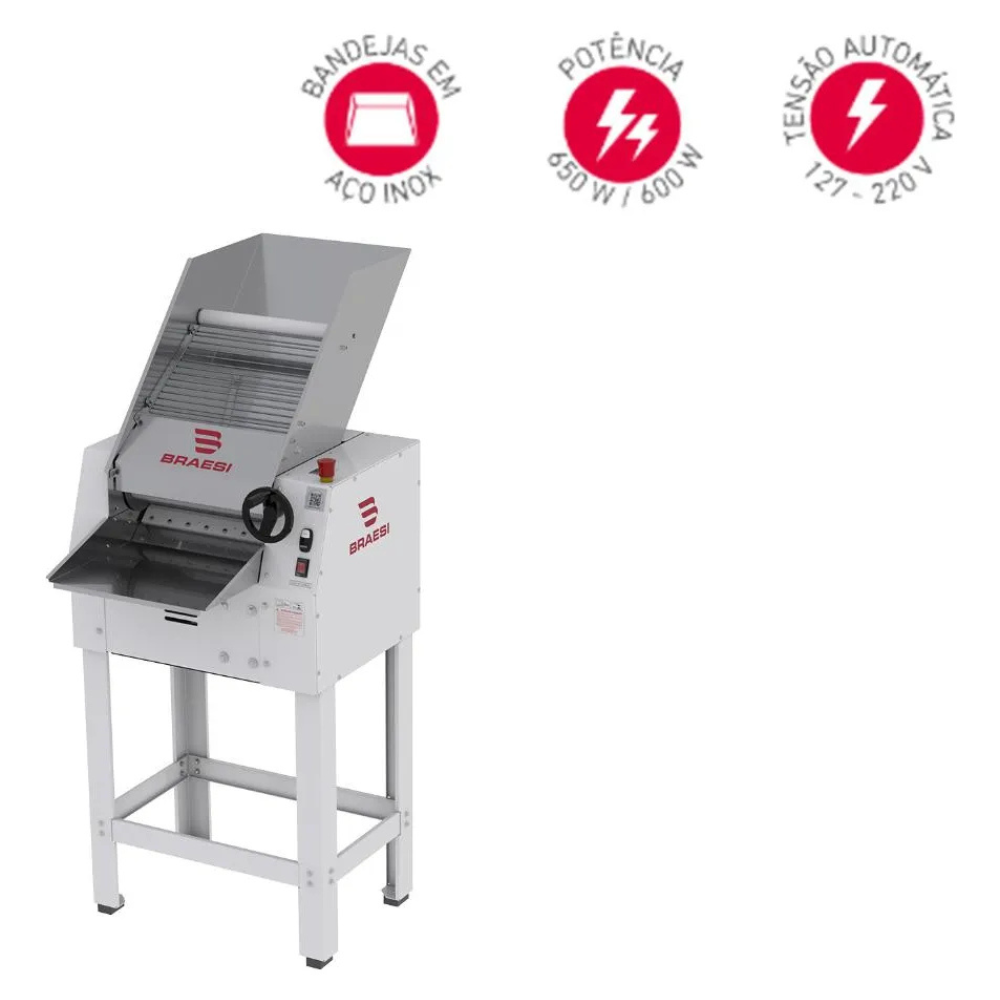 Fabricado com estrutura reforçada em aço com acabamento resistente. Possui rolos em aço de alta durabilidade e sistema de regulagem que permite ajustar a espessura da massa conforme a necessidade de produção.