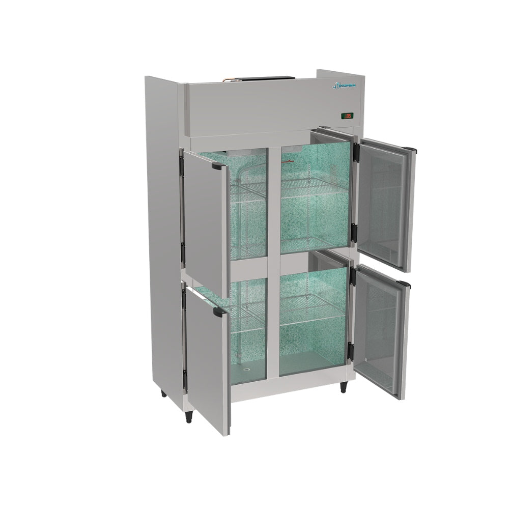Possui controle de temperatura, rodízios para facilitar movimentação e sistema anti-transpirante nas portas, garantindo melhor vedação e desempenho em ambientes profissionais.
