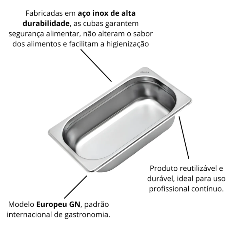 As cubas modelo europeu seguem o padrão gastronorm 1/4 permitindo encaixe preciso em equipamentos compatíveis. O formato facilita a organização de ingredientes e preparações em cozinhas industriais restaurantes padarias e hotéis.