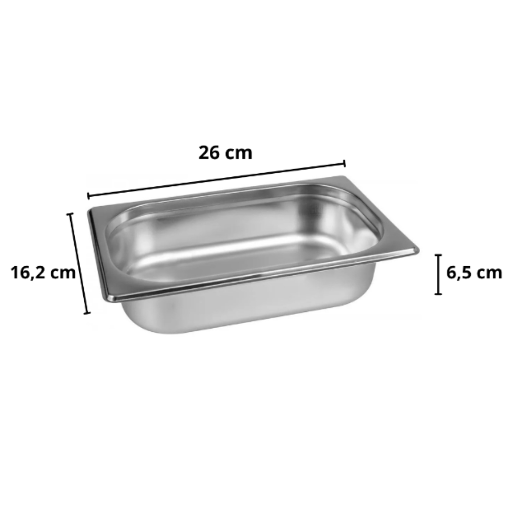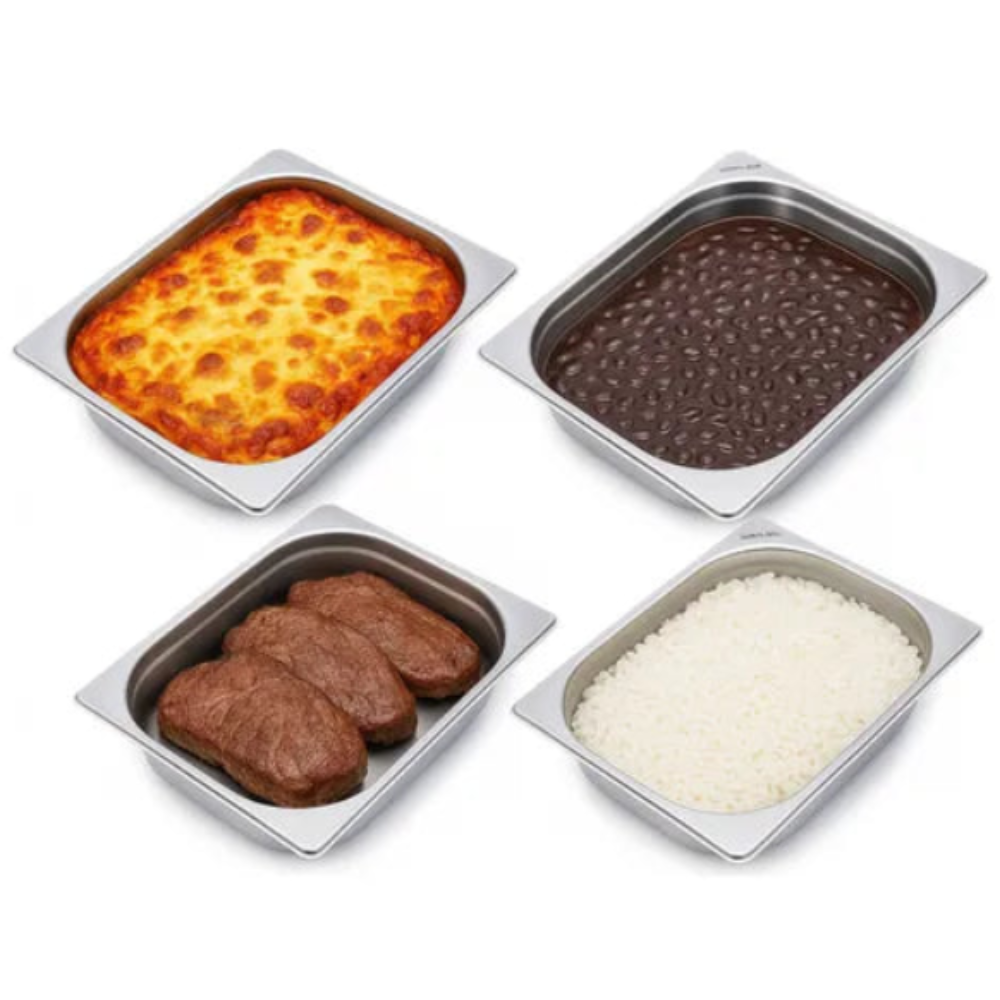 A cuba 1/4 65mm é indicado para acondicionamento de saladas guarnições molhos proteínas e demais preparações quentes ou frias conforme o equipamento utilizado. A profundidade de 65mm é adequada para porções controladas e reposição frequente em buffets.