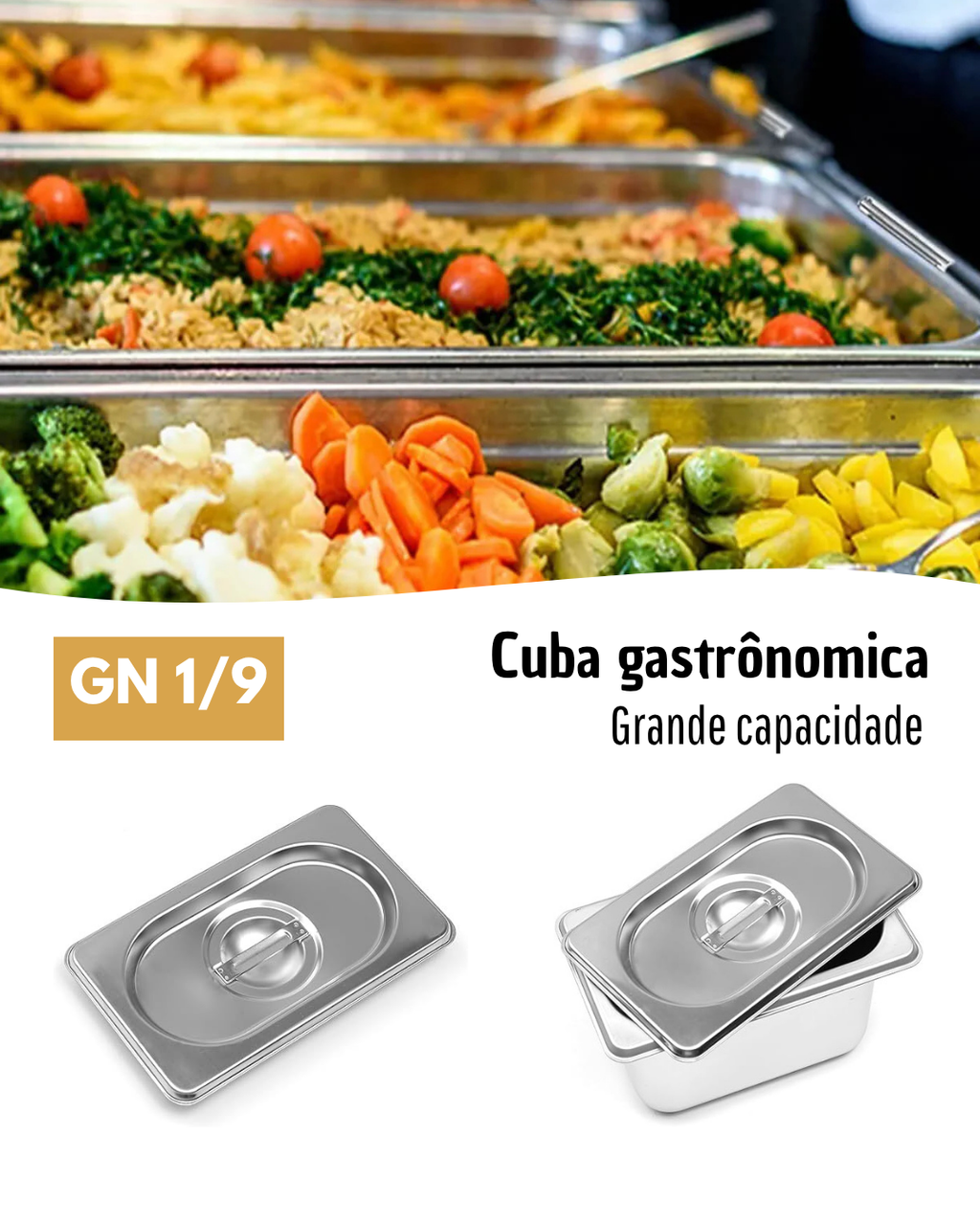 Compatibilidade Compatível com cubas gastronômicas padrão GN 1/1, 1/2, 1/3, 1/4 (varia conforme modelo adquirido)